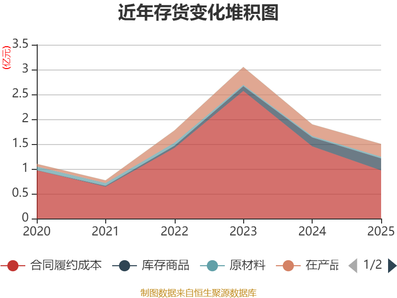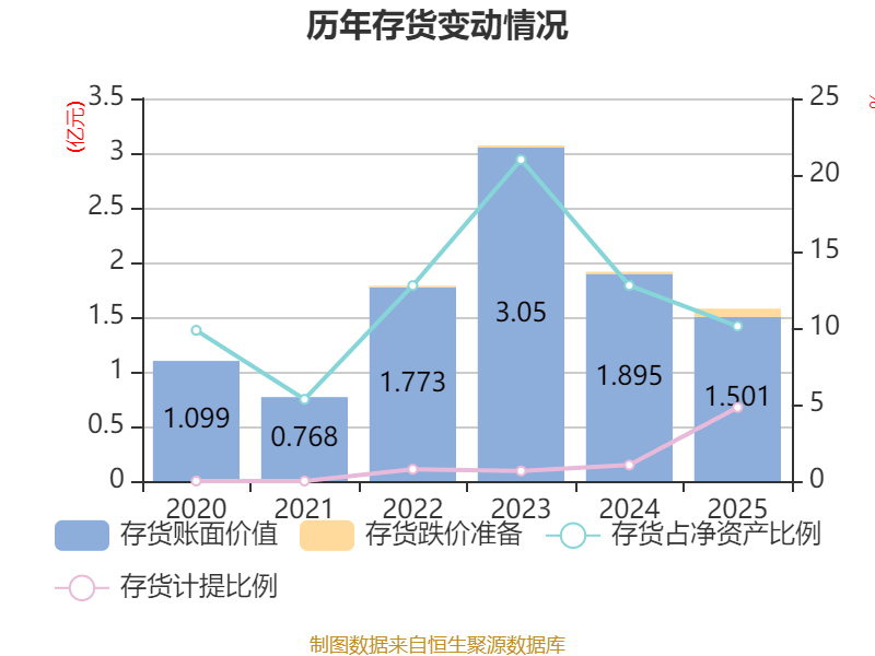 从存货变动来看,截至2025年末,公司存货账面价值为1.5亿元,占净资产的10.12%,较上年末减少3942.76万元。其中,存货跌价准备为757.96万元,计提比例为4.81%。