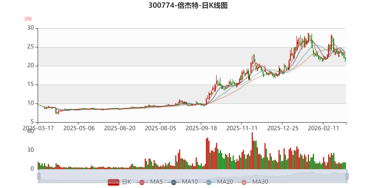 中证智能财讯倍杰特(300774)3月17日披露2025年年度报告。2025年,公司实现营业总收入10.12亿元,同比下降2.75%;归母净利润8135.1万元,同比下降38.96%;扣非净利润5749.15万元,同比下降55.10%;经营活动产生的现金流量净额为1.4亿元,同比增长38.39%;报告期内,倍杰特基本每股收益为0.2元,加权平均净资产收益率为5.51%。公司2025年度分配预案为:拟向全体股东每10股派现0.25元(含税)。