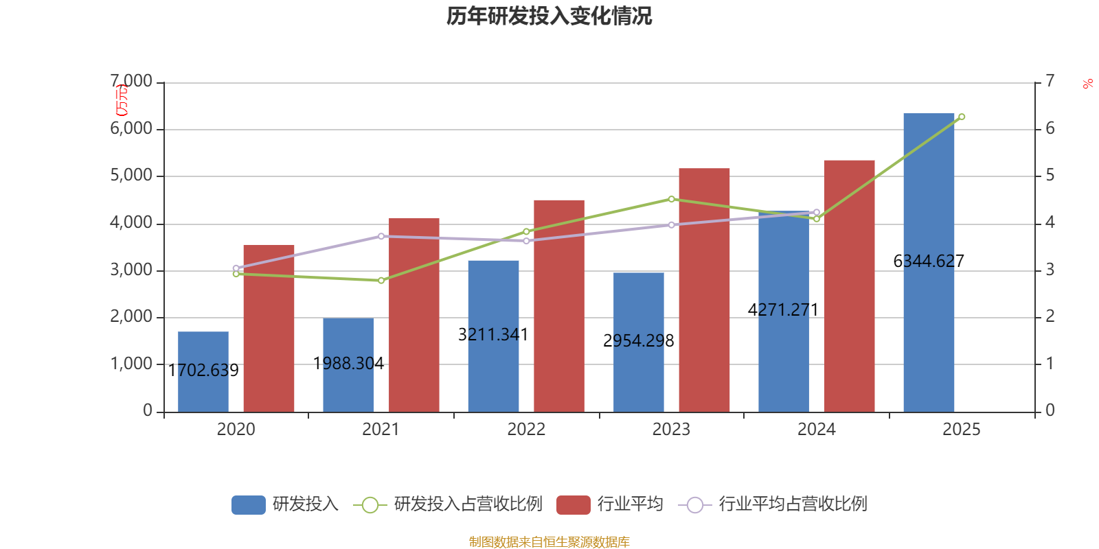 2025年全年,公司研发投入金额为6344.63万元,同比增长48.54%;研发投入占营业收入比例为6.27%,相比上年同期上升2.17个百分点。此外,公司全年研发投入资本化率为0%。