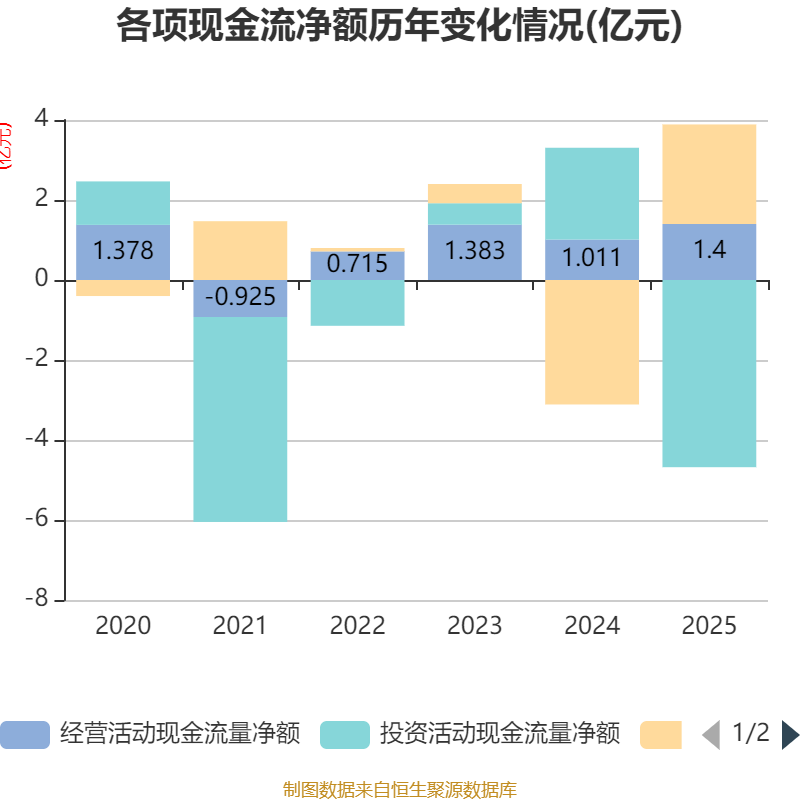 截至2025年,公司经营活动现金流净额为1.4亿元,同比增长38.39%;筹资活动现金流净额2.49亿元,同比增加5.6亿元;投资活动现金流净额-4.68亿元,上年同期为2.3亿元。