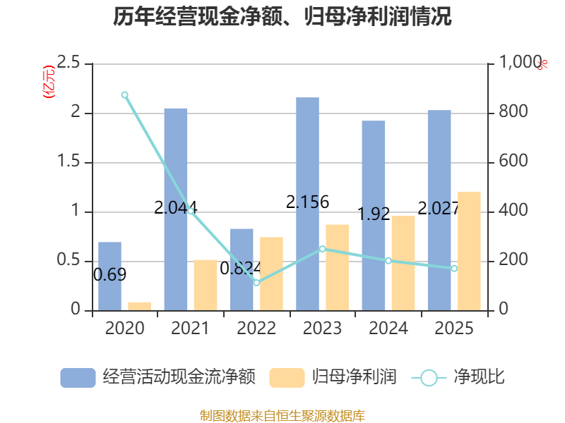 截至2025年,公司经营活动现金流净额为2.03亿元,同比增长5.53%;筹资活动现金流净额2823.85万元,同比增加8497.12万元;投资活动现金流净额-2.53亿元,上年同期为-2.02亿元。