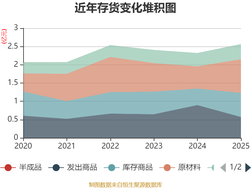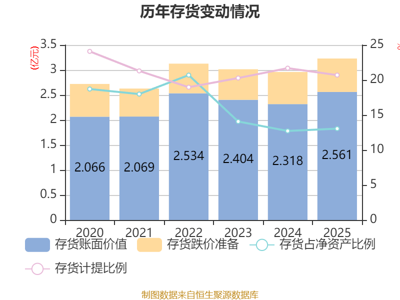 从存货变动来看,截至2025年末,公司存货账面价值为2.56亿元,占净资产的13.05%,较上年末增加2431.22万元。其中,存货跌价准备为6685.3万元,计提比例为20.7%。
